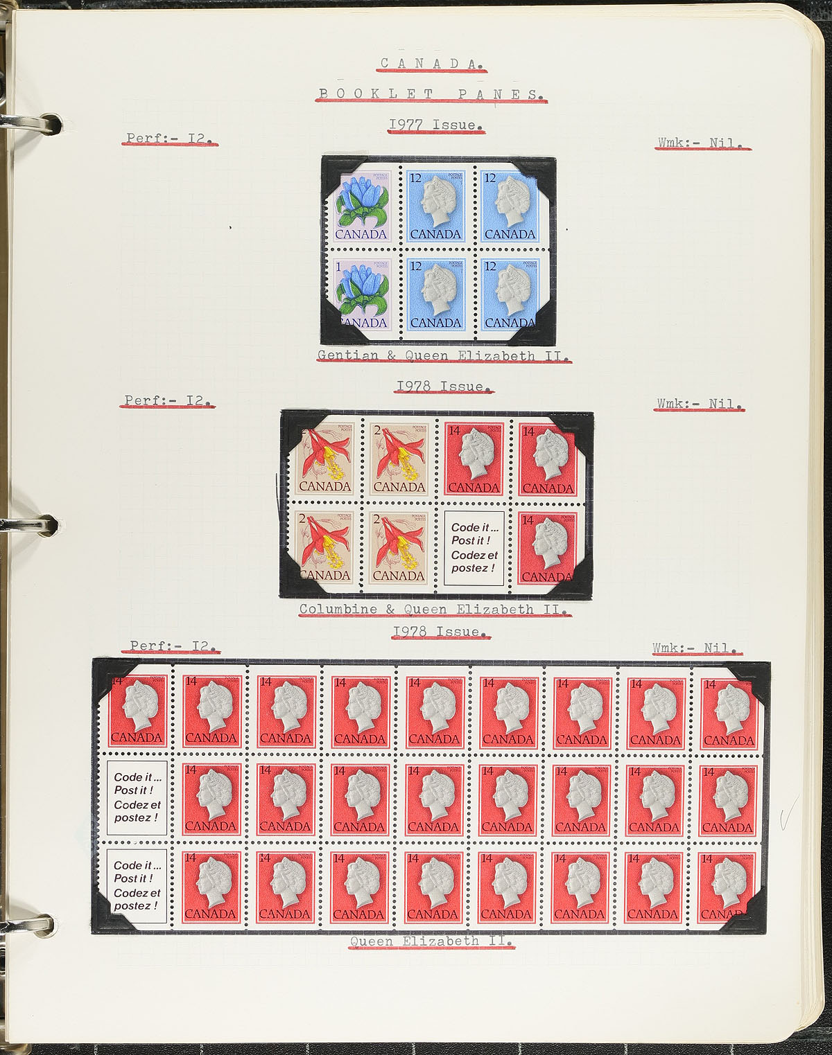 Mint Holding. Collection of mint never hinged Canada plate blocks and booklet panes, 1960s-1982, organized on well described pages. The stamps includes a selection definitive booklet panes (missing the selvedge), from the Wildings to 1982, along with plate blocks from Unitrade #704/906. The material is unhinged, and secured onto pages by the use of photo corners. Unitrade catalogue value for the lot totals $345, with a face value alone totaling $100.00. A very nice organized collection. Estimate =