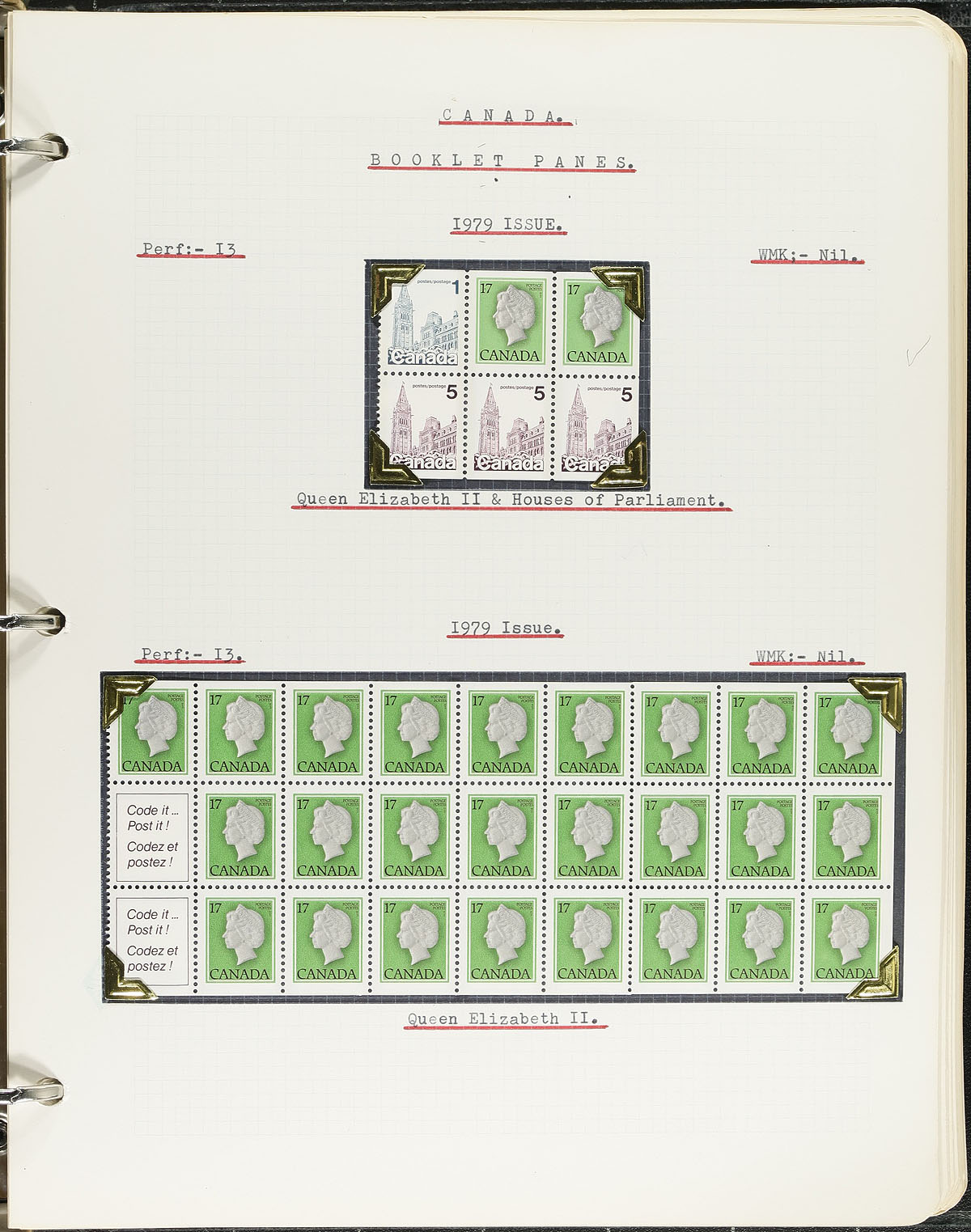Mint Holding. Collection of mint never hinged Canada plate blocks and booklet panes, 1960s-1982, organized on well described pages. The stamps includes a selection definitive booklet panes (missing the selvedge), from the Wildings to 1982, along with plate blocks from Unitrade #704/906. The material is unhinged, and secured onto pages by the use of photo corners. Unitrade catalogue value for the lot totals $345, with a face value alone totaling $100.00. A very nice organized collection. Estimate =