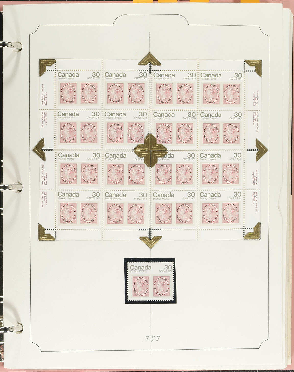 Mint Holding. Collection of mint never hinged Canada matched set of plate blocks, 1970's-1980's, organized on homemade pages, with blocks secured onto pages with the use of photo corners, along with a mint single for each issue. The collection ranges from Unitrade #741/863, and is roughly 85% complete in period. Unitrade catalogue value for the collection totals $575.05, face value alone totals $227.00. A good lot for Canada collectors or for postage needs. Estimate =