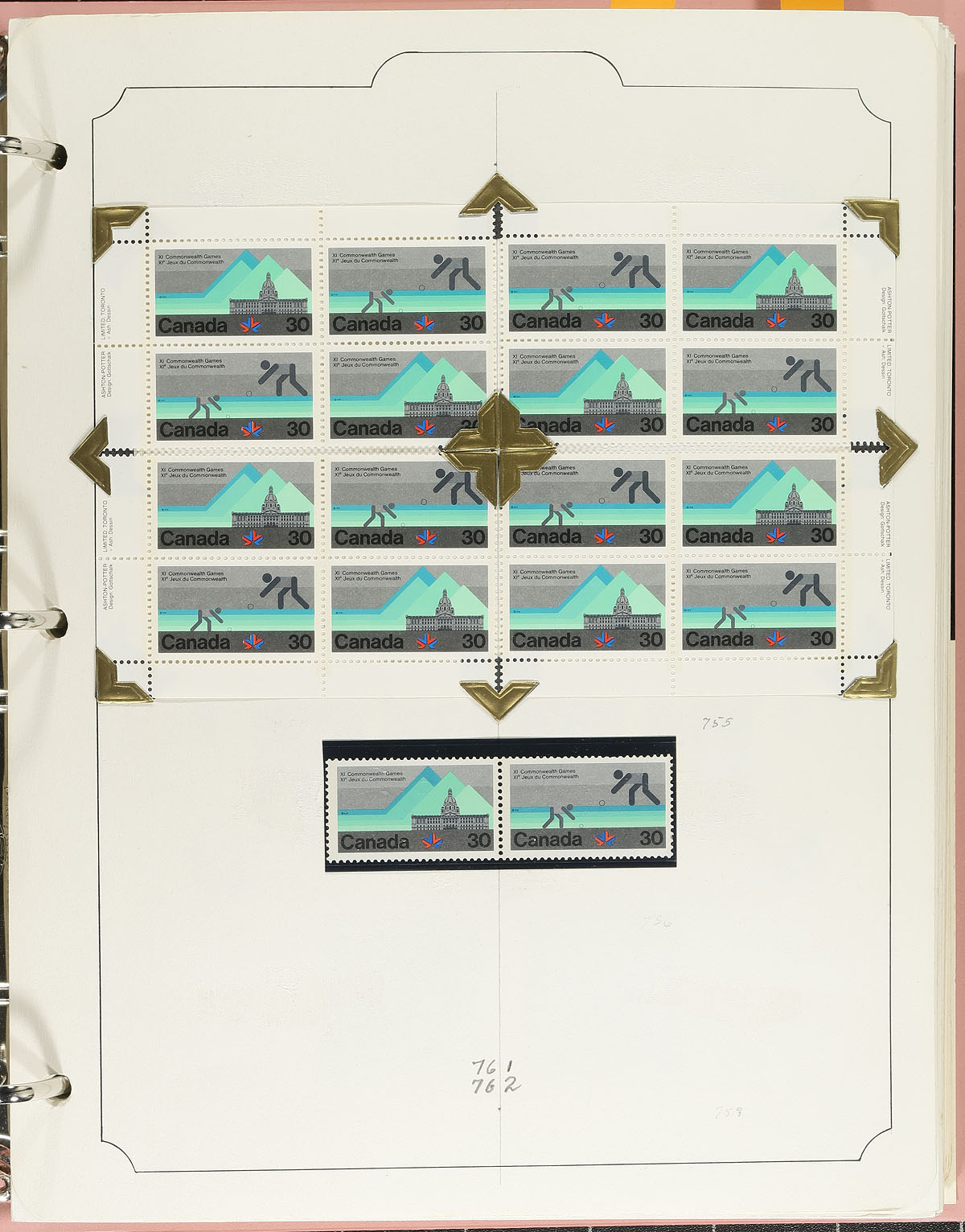 Mint Holding. Collection of mint never hinged Canada matched set of plate blocks, 1970's-1980's, organized on homemade pages, with blocks secured onto pages with the use of photo corners, along with a mint single for each issue. The collection ranges from Unitrade #741/863, and is roughly 85% complete in period. Unitrade catalogue value for the collection totals $575.05, face value alone totals $227.00. A good lot for Canada collectors or for postage needs. Estimate =