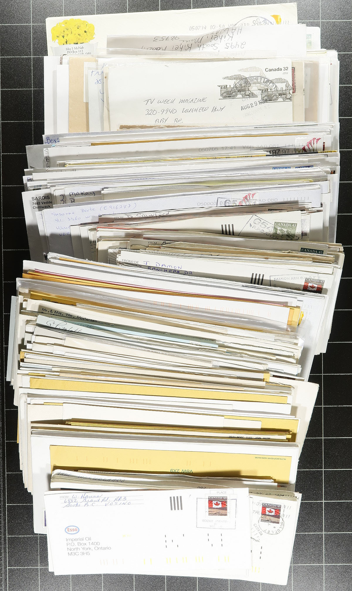 British Columbia Postal History. Group of 600 commercial covers with B.C. town postmarks, 1970's-2000's, representing a few hundred different towns from A to Z, with the vast majority having a variety of POCON types, along with pictorials, Klussendorf, cds, slogans, and a few other postmark types, include a few from sub offices and outlets. Just a few of the towns include Bowen Island, Zeballos, Mount Lehman, Mayne Island, Murrayville Square Langley, Lake Country, Forward Division Vancouver, Hornby Island, Pink Mountain, Port McNeil, and much more. Most covers are #10 in size, as is the nature with commercial mail. A nice lot for the British Columbia or Canada postmark collector. Estimate =