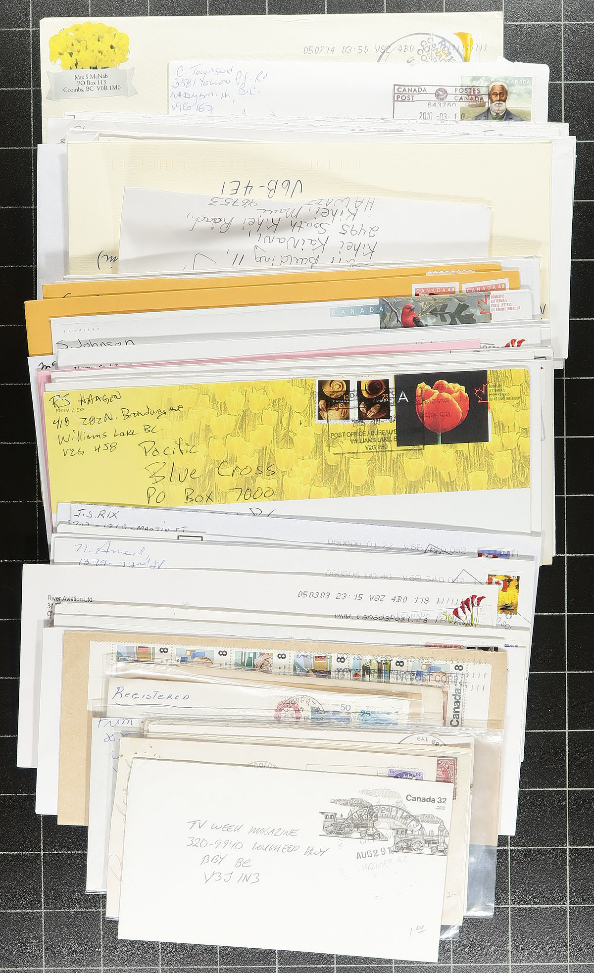 British Columbia Postal History. Group of 600 commercial covers with B.C. town postmarks, 1970's-2000's, representing a few hundred different towns from A to Z, with the vast majority having a variety of POCON types, along with pictorials, Klussendorf, cds, slogans, and a few other postmark types, include a few from sub offices and outlets. Just a few of the towns include Bowen Island, Zeballos, Mount Lehman, Mayne Island, Murrayville Square Langley, Lake Country, Forward Division Vancouver, Hornby Island, Pink Mountain, Port McNeil, and much more. Most covers are #10 in size, as is the nature with commercial mail. A nice lot for the British Columbia or Canada postmark collector. Estimate =
