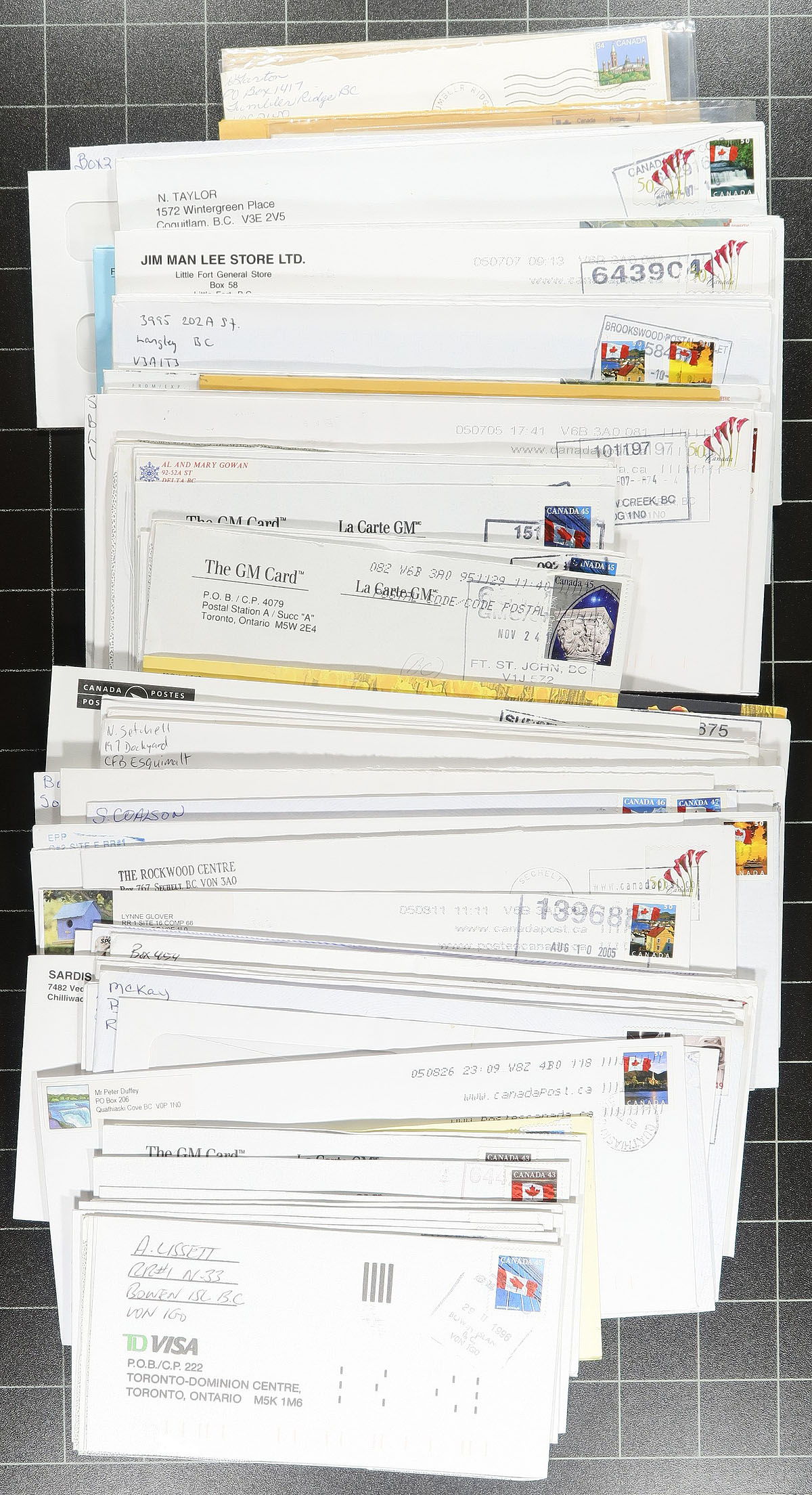 British Columbia Postal History. Group of 600 commercial covers with B.C. town postmarks, 1970's-2000's, representing a few hundred different towns from A to Z, with the vast majority having a variety of POCON types, along with pictorials, Klussendorf, cds, slogans, and a few other postmark types, include a few from sub offices and outlets. Just a few of the towns include Bowen Island, Zeballos, Mount Lehman, Mayne Island, Murrayville Square Langley, Lake Country, Forward Division Vancouver, Hornby Island, Pink Mountain, Port McNeil, and much more. Most covers are #10 in size, as is the nature with commercial mail. A nice lot for the British Columbia or Canada postmark collector. Estimate =