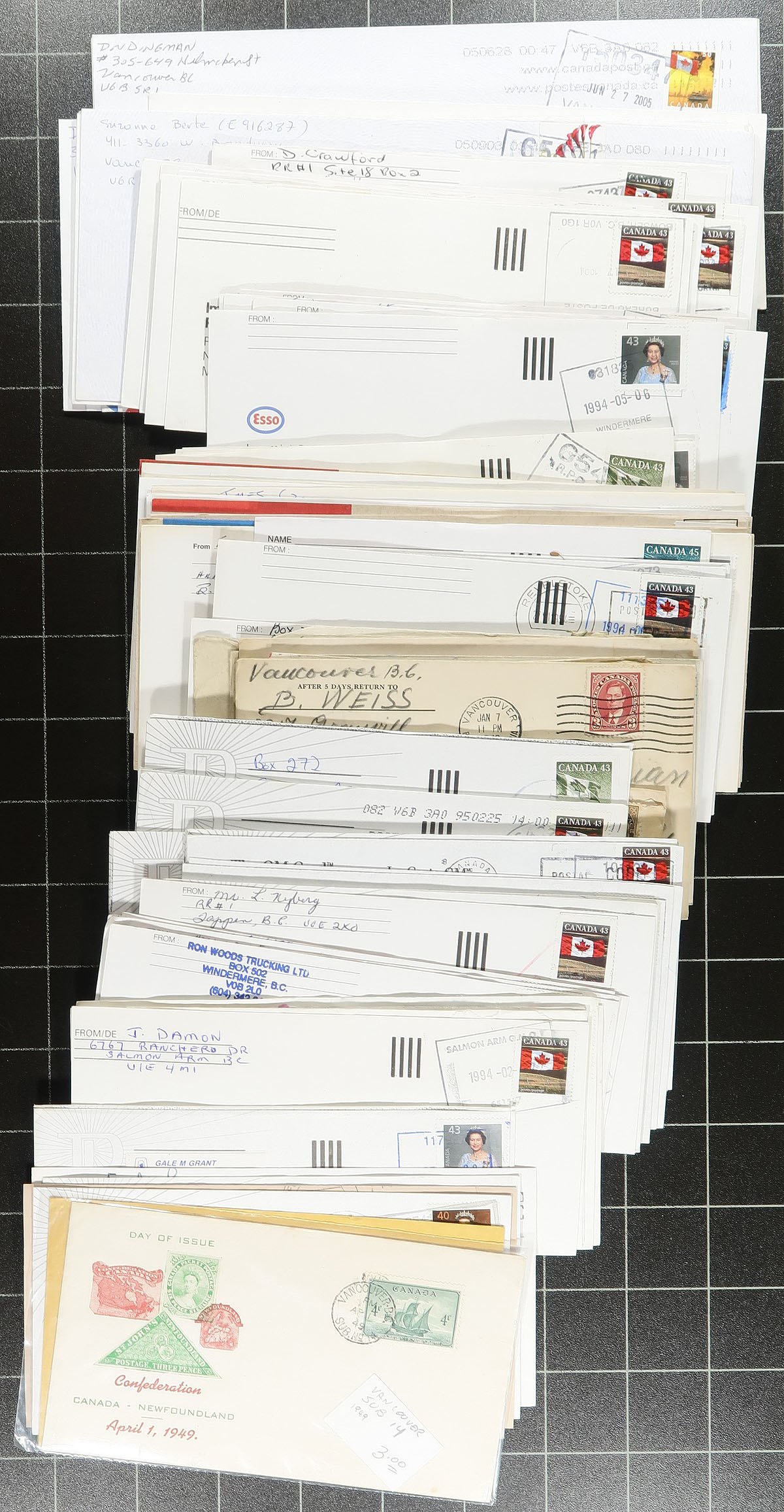 British Columbia Postal History. Group of 600 commercial covers with B.C. town postmarks, 1970's-2000's, representing a few hundred different towns from A to Z, with the vast majority having a variety of POCON types, along with pictorials, Klussendorf, cds, slogans, and a few other postmark types, include a few from sub offices and outlets. Just a few of the towns include Bowen Island, Zeballos, Mount Lehman, Mayne Island, Murrayville Square Langley, Lake Country, Forward Division Vancouver, Hornby Island, Pink Mountain, Port McNeil, and much more. Most covers are #10 in size, as is the nature with commercial mail. A nice lot for the British Columbia or Canada postmark collector. Estimate =