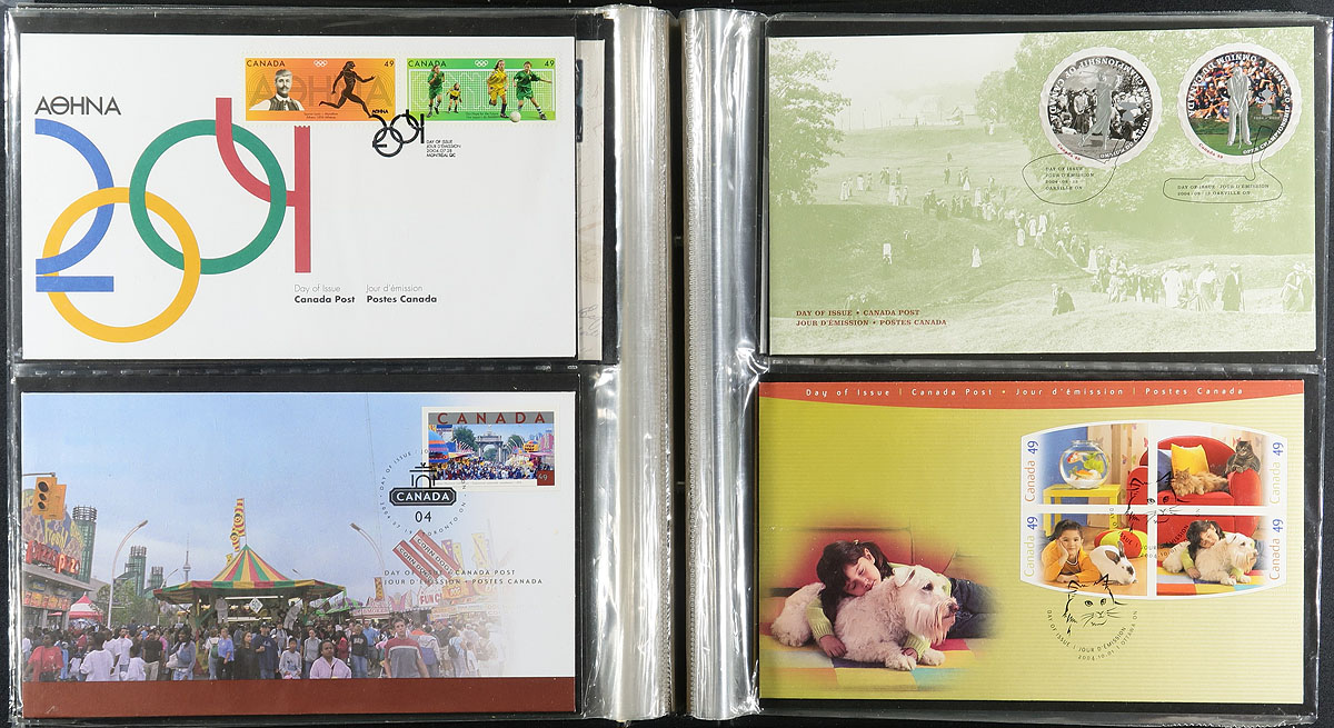 First Day Covers. Collection of roughly 500 Canada First day covers, 1990's-2010, well organized in 6 Uni-Safe cover albums. The covers generally range from 1997-2010, along with a few earlier covers, with singles, plate blocks, souvenir sheet, and high denomination frankings. Duplication up to 2 for a few issues. A nice clean lot for collectors and dealers alike, with 6 gently used albums as a bonus. Estimate =