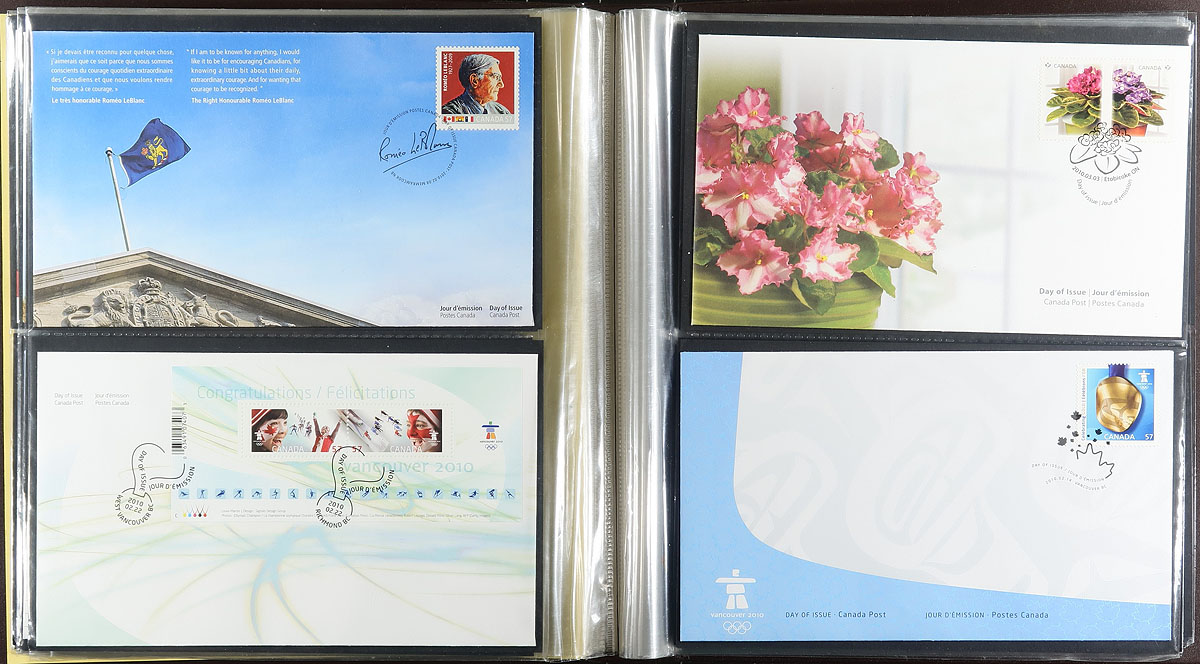 First Day Covers. Collection of roughly 500 Canada First day covers, 1990's-2010, well organized in 6 Uni-Safe cover albums. The covers generally range from 1997-2010, along with a few earlier covers, with singles, plate blocks, souvenir sheet, and high denomination frankings. Duplication up to 2 for a few issues. A nice clean lot for collectors and dealers alike, with 6 gently used albums as a bonus. Estimate =