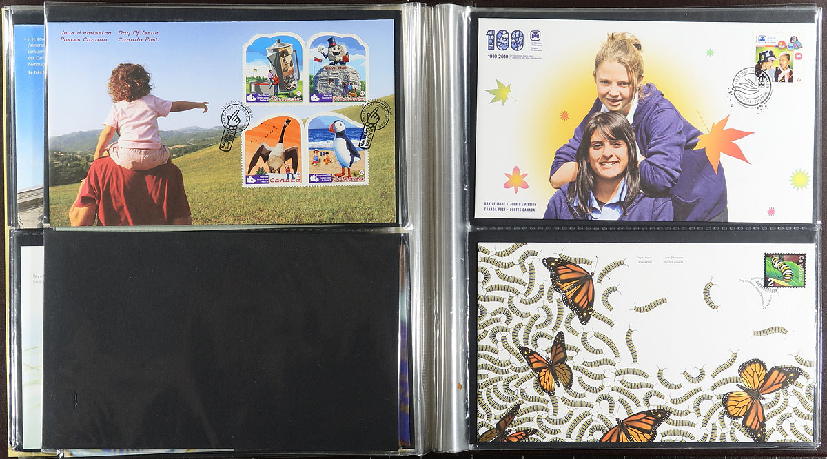 First Day Covers. Collection of roughly 500 Canada First day covers, 1990's-2010, well organized in 6 Uni-Safe cover albums. The covers generally range from 1997-2010, along with a few earlier covers, with singles, plate blocks, souvenir sheet, and high denomination frankings. Duplication up to 2 for a few issues. A nice clean lot for collectors and dealers alike, with 6 gently used albums as a bonus. Estimate =