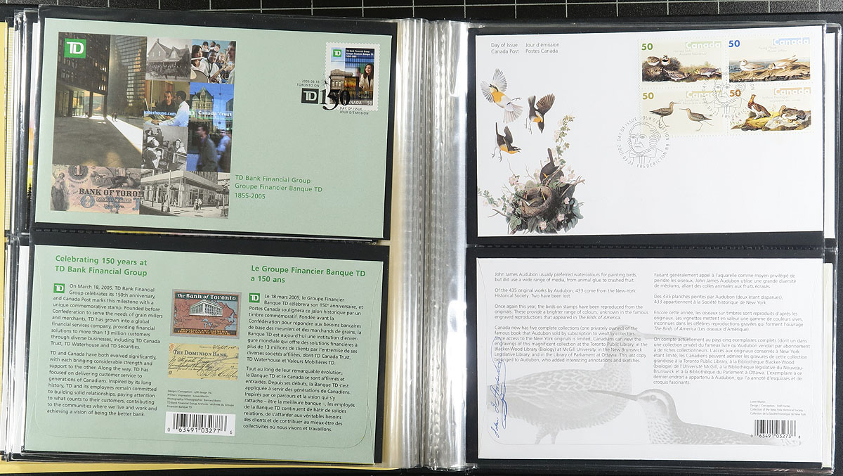 First Day Covers. Collection of roughly 500 Canada First day covers, 1990's-2010, well organized in 6 Uni-Safe cover albums. The covers generally range from 1997-2010, along with a few earlier covers, with singles, plate blocks, souvenir sheet, and high denomination frankings. Duplication up to 2 for a few issues. A nice clean lot for collectors and dealers alike, with 6 gently used albums as a bonus. Estimate =