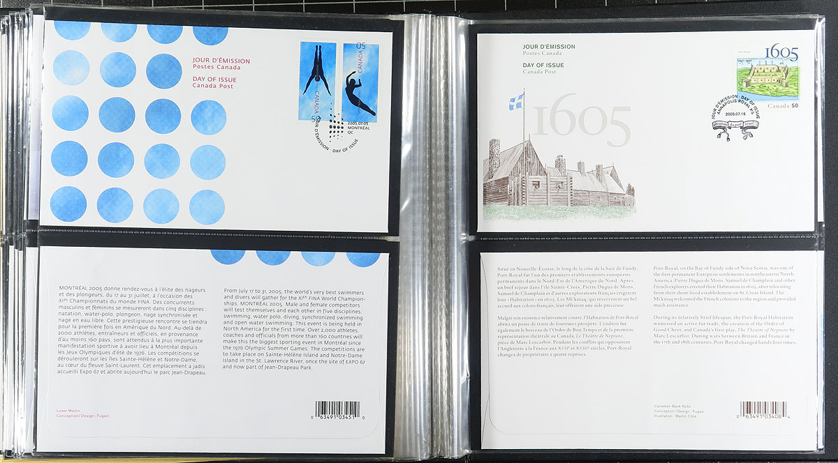 First Day Covers. Collection of roughly 500 Canada First day covers, 1990's-2010, well organized in 6 Uni-Safe cover albums. The covers generally range from 1997-2010, along with a few earlier covers, with singles, plate blocks, souvenir sheet, and high denomination frankings. Duplication up to 2 for a few issues. A nice clean lot for collectors and dealers alike, with 6 gently used albums as a bonus. Estimate =
