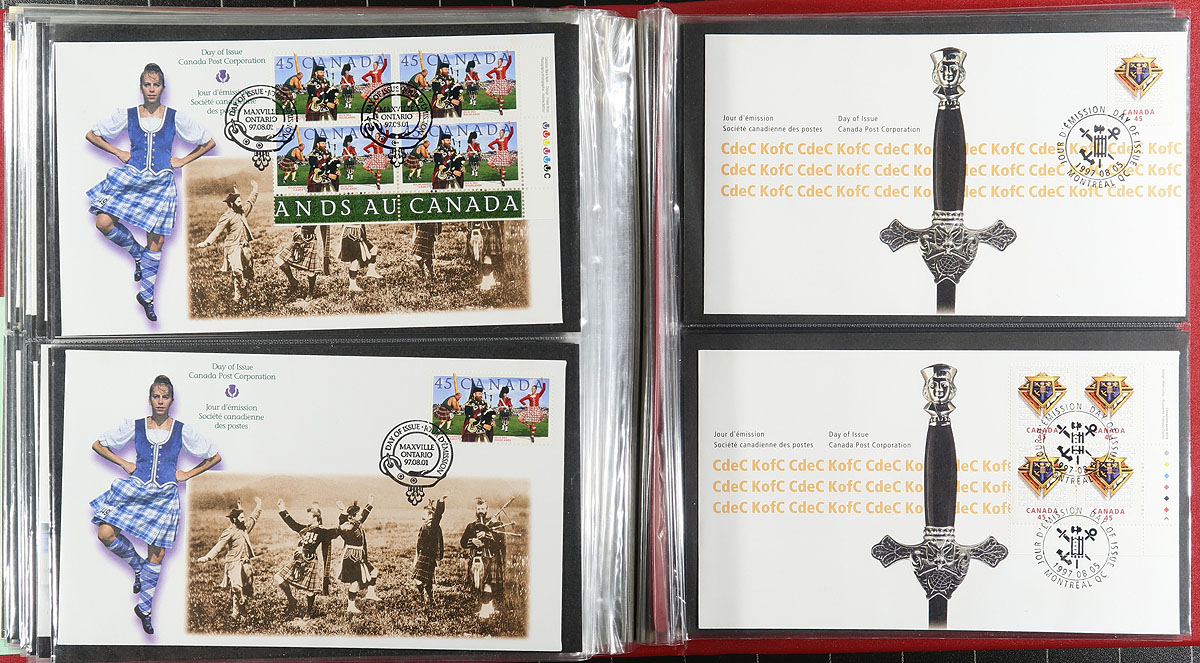 First Day Covers. Collection of roughly 500 Canada First day covers, 1990's-2010, well organized in 6 Uni-Safe cover albums. The covers generally range from 1997-2010, along with a few earlier covers, with singles, plate blocks, souvenir sheet, and high denomination frankings. Duplication up to 2 for a few issues. A nice clean lot for collectors and dealers alike, with 6 gently used albums as a bonus. Estimate =