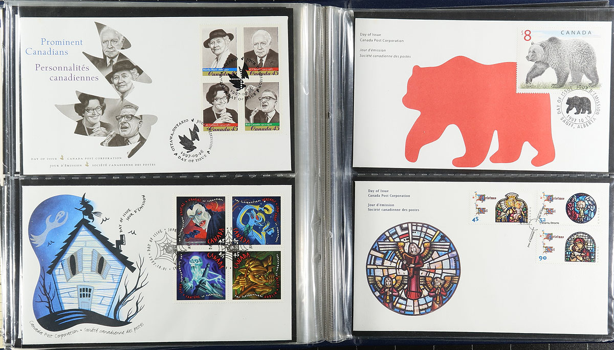 First Day Covers. Collection of roughly 500 Canada First day covers, 1990's-2010, well organized in 6 Uni-Safe cover albums. The covers generally range from 1997-2010, along with a few earlier covers, with singles, plate blocks, souvenir sheet, and high denomination frankings. Duplication up to 2 for a few issues. A nice clean lot for collectors and dealers alike, with 6 gently used albums as a bonus. Estimate =