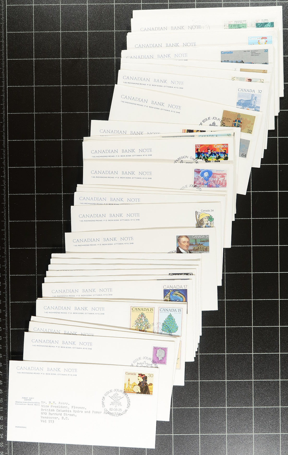 First Day Covers. Group of roughly 165 Canadian Bank Note issued FDC, 1968-1987, noting singles, pairs, sets, blocks, and high denomination frankings. Duplication up to one in a few cases. A nice grouping not often seen in this quantity, overall fine to very fine. Estimate =