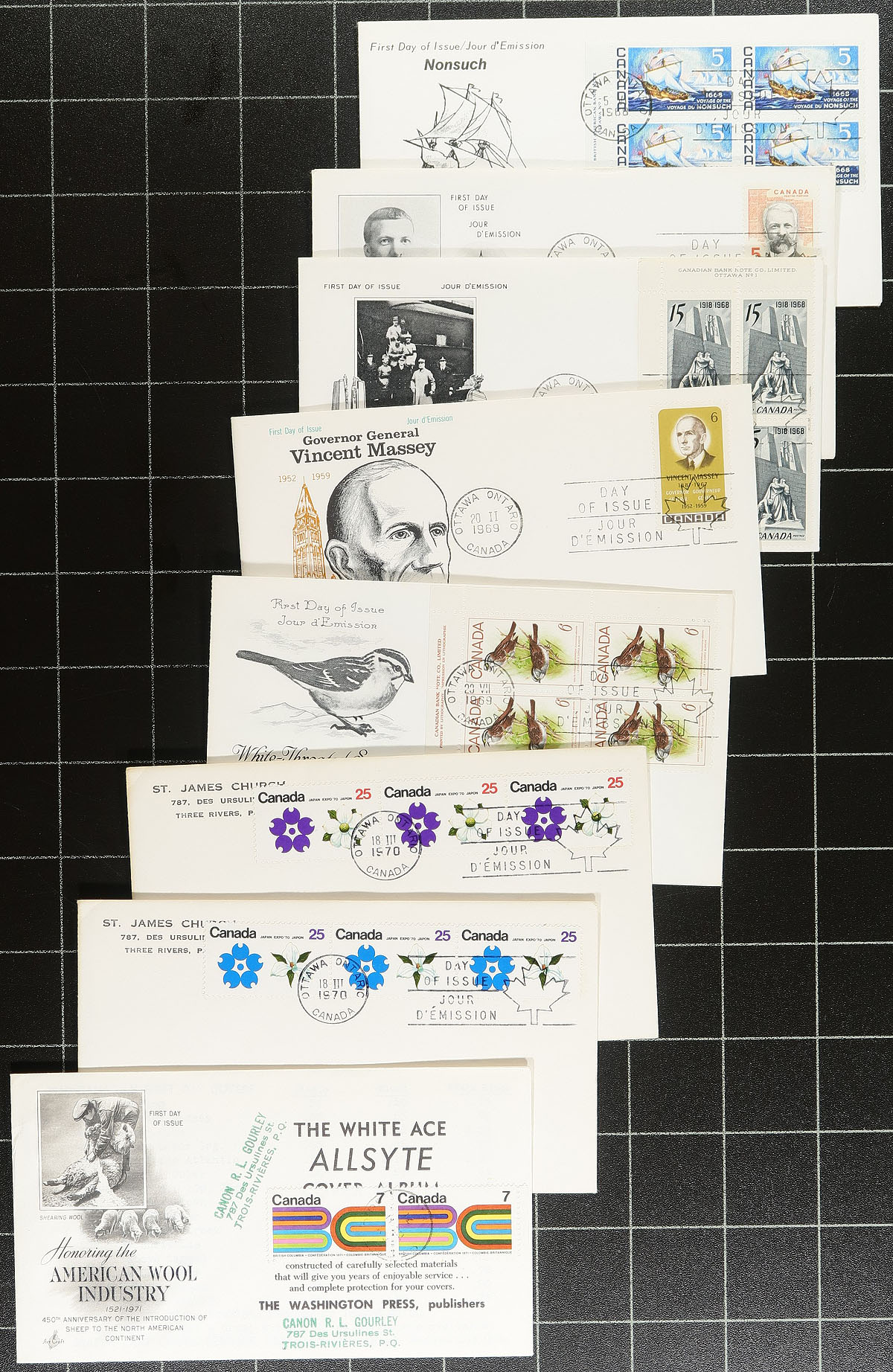First Day Covers. Collection / Accumulation of roughly 500 Canada first day covers, 1968-1971, covering Unitrade #478-552, with almost each issue having uncacheted and private cachet covers (mainly Cole and Rose Craft), with singles, pairs, sets, and plate blocks (various positions) frankings. Duplication appears to be 3 to 4 for some issues. A nice complete grouping of these issues, overall fine to very fine. Estimate =