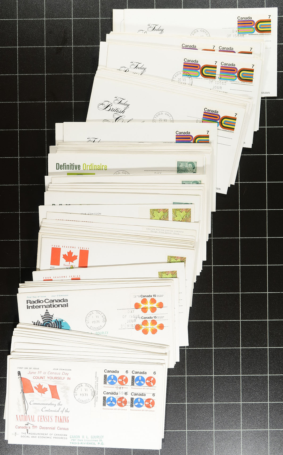 First Day Covers. Collection / Accumulation of roughly 500 Canada first day covers, 1968-1971, covering Unitrade #478-552, with almost each issue having uncacheted and private cachet covers (mainly Cole and Rose Craft), with singles, pairs, sets, and plate blocks (various positions) frankings. Duplication appears to be 3 to 4 for some issues. A nice complete grouping of these issues, overall fine to very fine. Estimate =