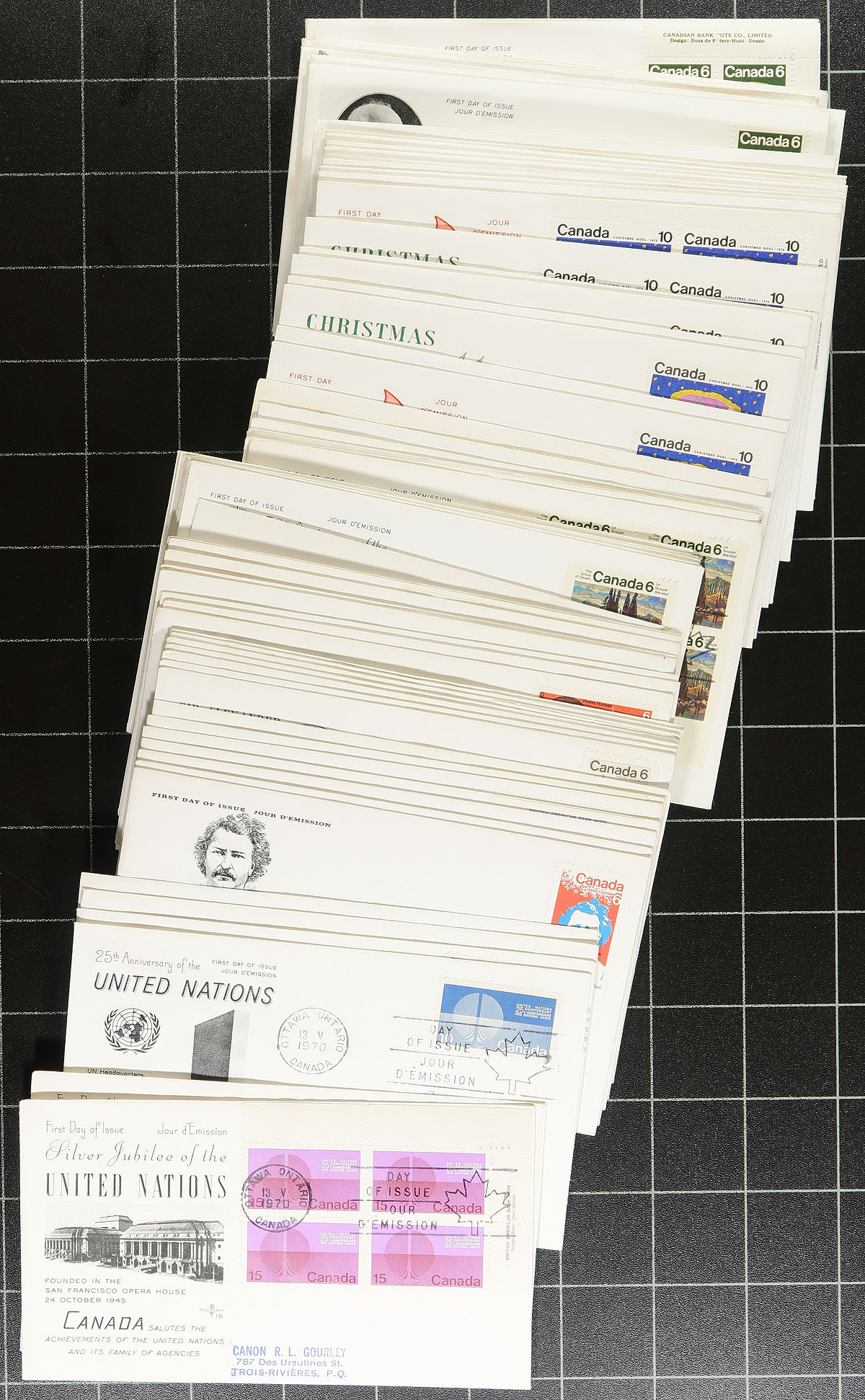 First Day Covers. Collection / Accumulation of roughly 500 Canada first day covers, 1968-1971, covering Unitrade #478-552, with almost each issue having uncacheted and private cachet covers (mainly Cole and Rose Craft), with singles, pairs, sets, and plate blocks (various positions) frankings. Duplication appears to be 3 to 4 for some issues. A nice complete grouping of these issues, overall fine to very fine. Estimate =