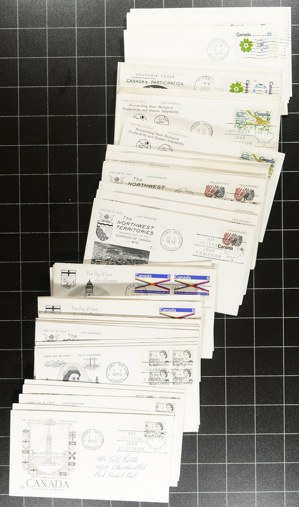 First Day Covers. Collection / Accumulation of roughly 500 Canada first day covers, 1968-1971, covering Unitrade #478-552, with almost each issue having uncacheted and private cachet covers (mainly Cole and Rose Craft), with singles, pairs, sets, and plate blocks (various positions) frankings. Duplication appears to be 3 to 4 for some issues. A nice complete grouping of these issues, overall fine to very fine. Estimate =