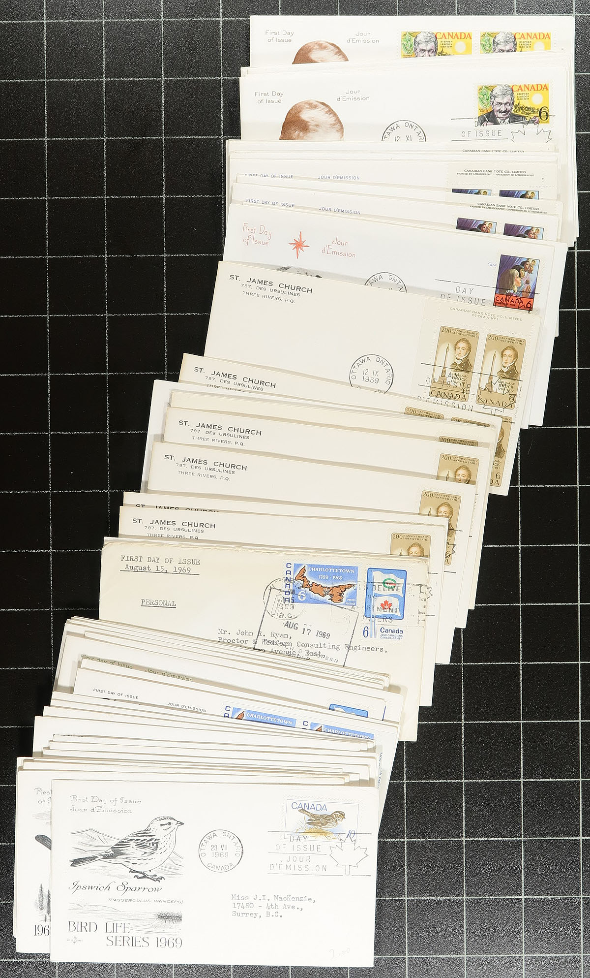 First Day Covers. Collection / Accumulation of roughly 500 Canada first day covers, 1968-1971, covering Unitrade #478-552, with almost each issue having uncacheted and private cachet covers (mainly Cole and Rose Craft), with singles, pairs, sets, and plate blocks (various positions) frankings. Duplication appears to be 3 to 4 for some issues. A nice complete grouping of these issues, overall fine to very fine. Estimate =