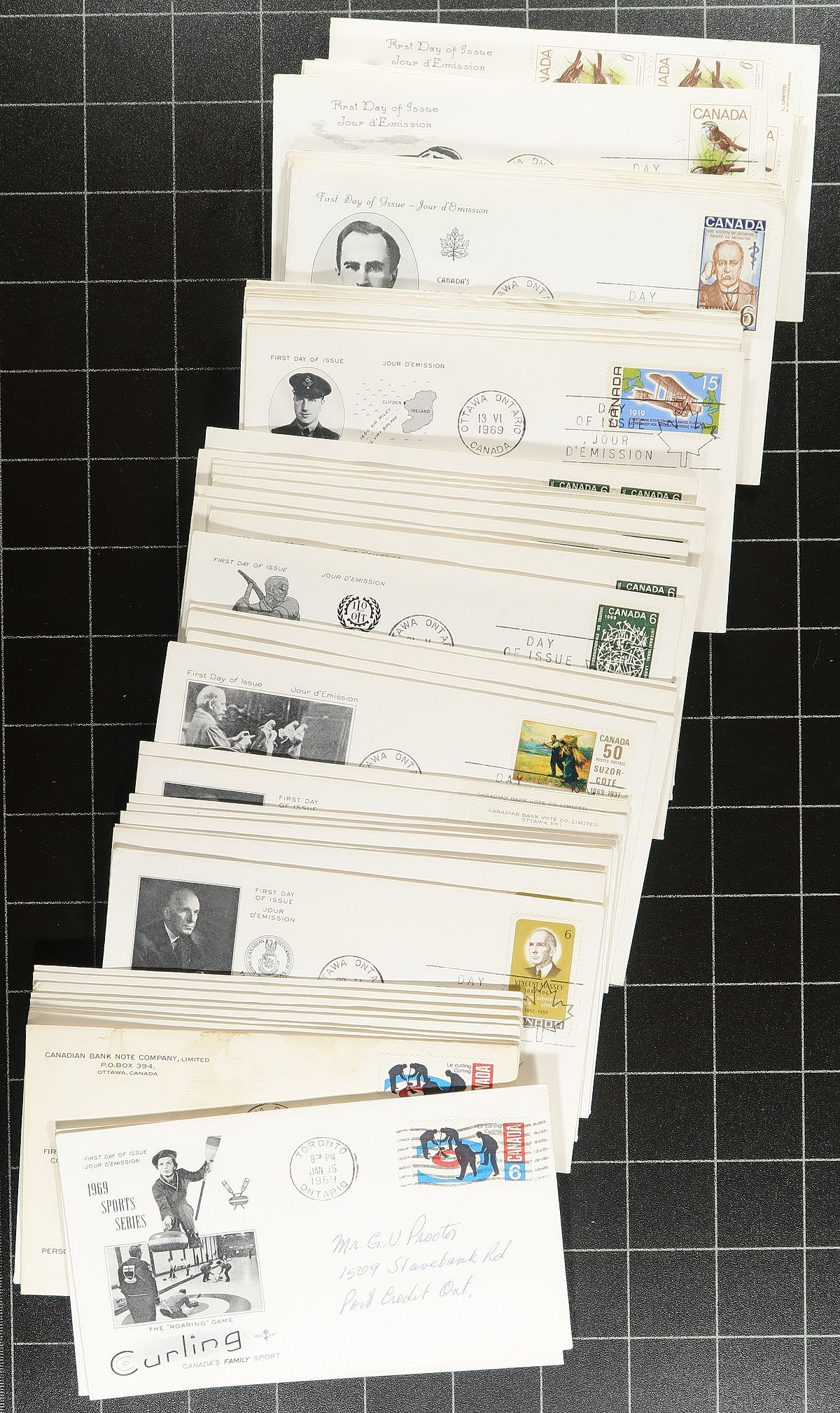 First Day Covers. Collection / Accumulation of roughly 500 Canada first day covers, 1968-1971, covering Unitrade #478-552, with almost each issue having uncacheted and private cachet covers (mainly Cole and Rose Craft), with singles, pairs, sets, and plate blocks (various positions) frankings. Duplication appears to be 3 to 4 for some issues. A nice complete grouping of these issues, overall fine to very fine. Estimate =