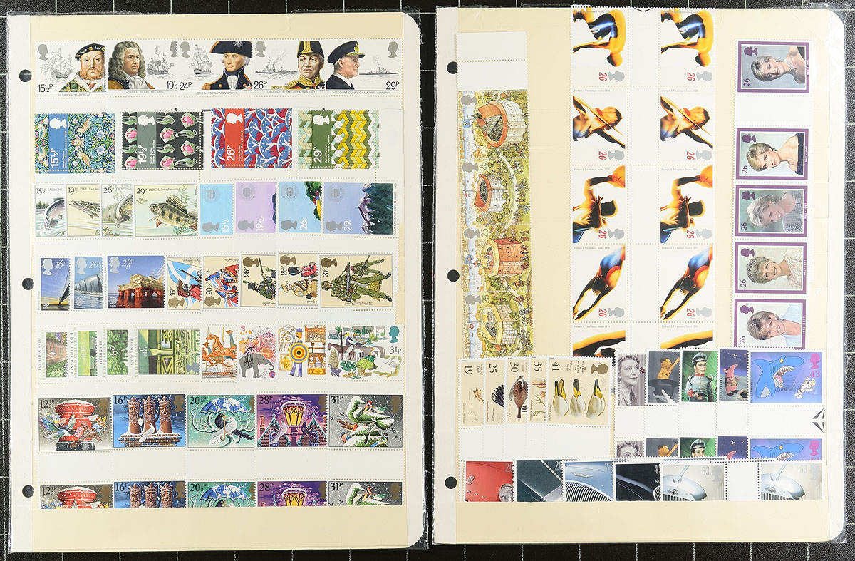Collection / Accumulation of primarily never hinged Great Britian, 1911-2014, containing many hundreds of stamps in roughly 20 album or stock pages. The majority of the lot consists of sets from the 1980's onwards, with a few earlier singles and sets cataloguing in the $5 to $10 range. Owner's 2004 Scott catalogue value for the collection totals $1,052.00. We estimate face value to be roughly £250.00, making this a nice lot for collectors and postage users alike. Estimate =