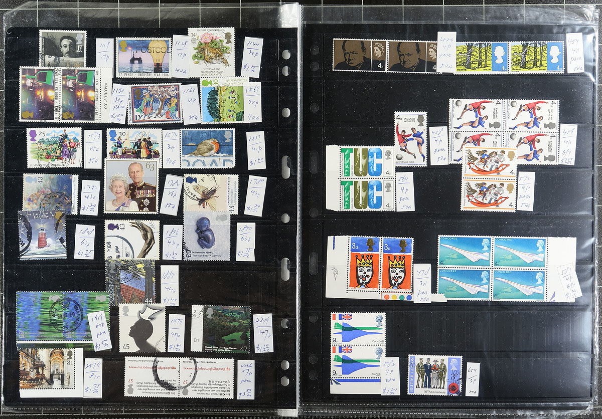 Collection / Accumulation of primarily never hinged Great Britian, 1911-2014, containing many hundreds of stamps in roughly 20 album or stock pages. The majority of the lot consists of sets from the 1980's onwards, with a few earlier singles and sets cataloguing in the $5 to $10 range. Owner's 2004 Scott catalogue value for the collection totals $1,052.00. We estimate face value to be roughly £250.00, making this a nice lot for collectors and postage users alike. Estimate =