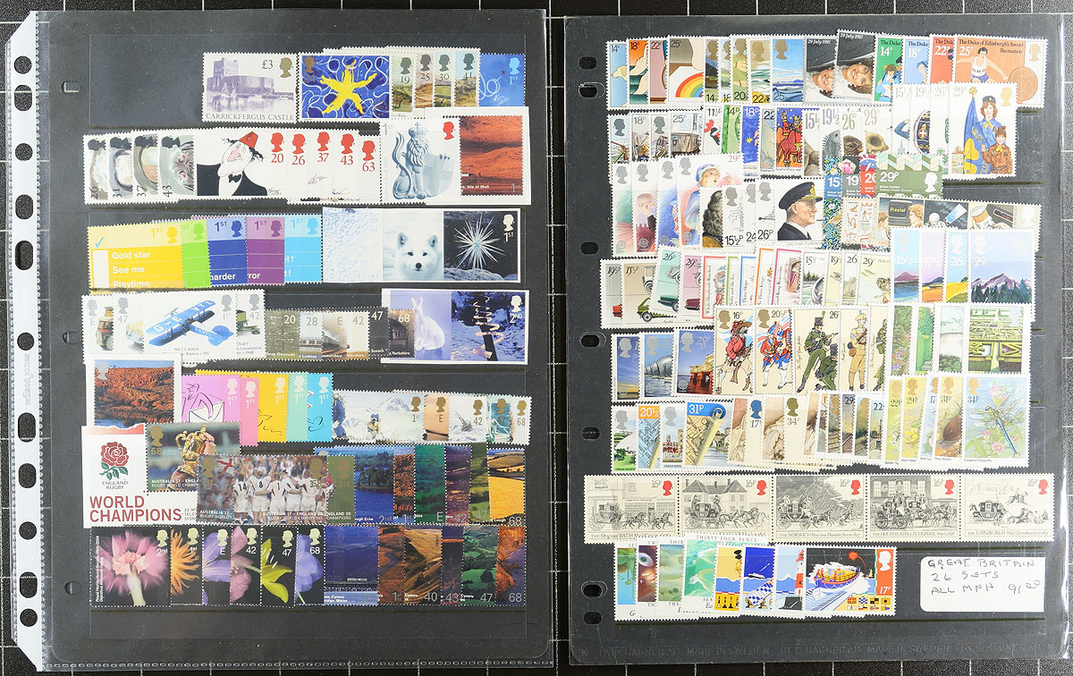 Collection / Accumulation of primarily never hinged Great Britian, 1911-2014, containing many hundreds of stamps in roughly 20 album or stock pages. The majority of the lot consists of sets from the 1980's onwards, with a few earlier singles and sets cataloguing in the $5 to $10 range. Owner's 2004 Scott catalogue value for the collection totals $1,052.00. We estimate face value to be roughly £250.00, making this a nice lot for collectors and postage users alike. Estimate =