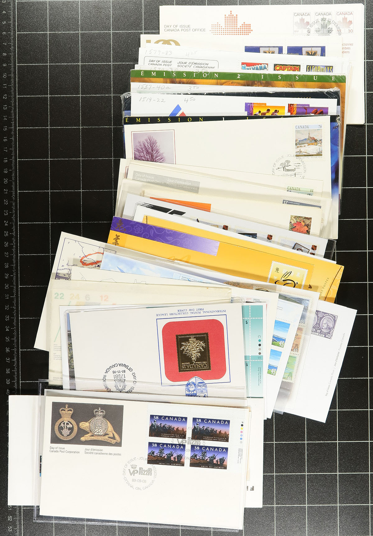First Day Covers. Accumulation of roughly 1,000 Canada first day covers in a bankers box. The lot generally ranges from the 1970's to the 1990's, but did spot covers from either side of the given range. We note singles, sets, many plate blocks, booklets, souvenir sheets. and high denomination frankings, along with Unitrade #1250ii Regiments plate block (c.v. $125) and British American Bank Note first day covers. Duplication up to 3 for a few issues. A nice lot for the collector or dealer. Estimate =