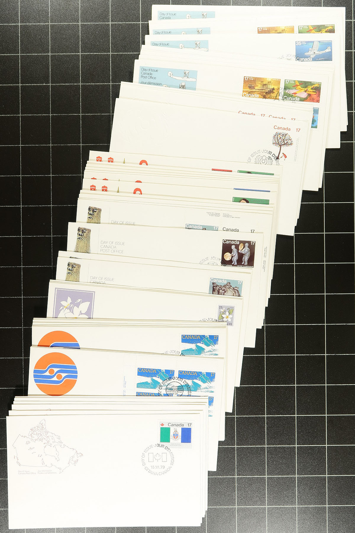First Day Covers. Accumulation of roughly 1,000 Canada first day covers in a bankers box. The lot generally ranges from the 1970's to the 1990's, but did spot covers from either side of the given range. We note singles, sets, many plate blocks, booklets, souvenir sheets. and high denomination frankings, along with Unitrade #1250ii Regiments plate block (c.v. $125) and British American Bank Note first day covers. Duplication up to 3 for a few issues. A nice lot for the collector or dealer. Estimate =