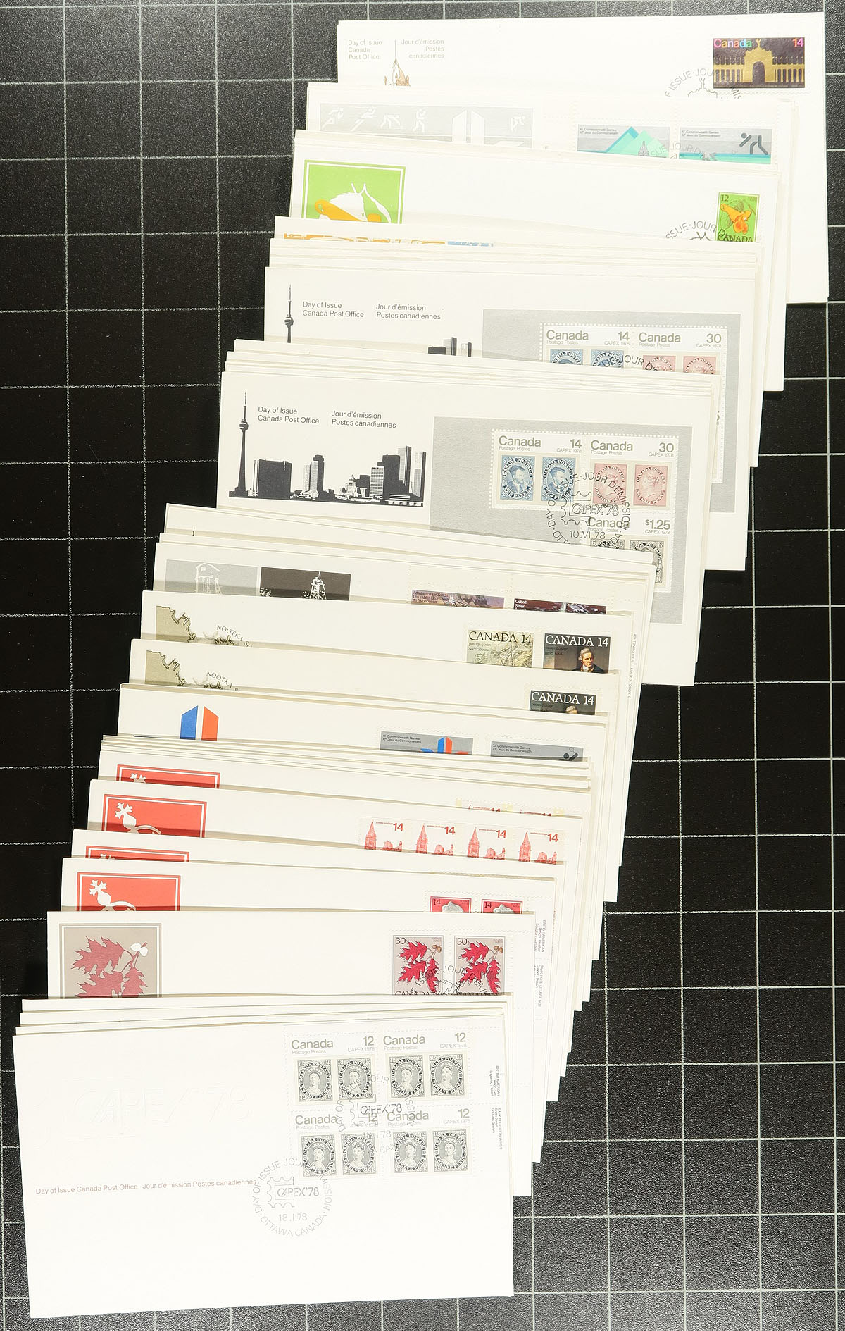 First Day Covers. Accumulation of roughly 1,000 Canada first day covers in a bankers box. The lot generally ranges from the 1970's to the 1990's, but did spot covers from either side of the given range. We note singles, sets, many plate blocks, booklets, souvenir sheets. and high denomination frankings, along with Unitrade #1250ii Regiments plate block (c.v. $125) and British American Bank Note first day covers. Duplication up to 3 for a few issues. A nice lot for the collector or dealer. Estimate =
