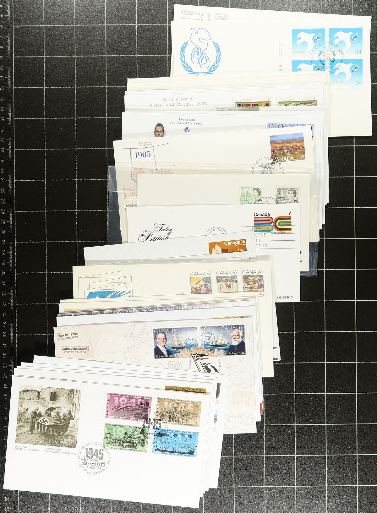First Day Covers. Accumulation of roughly 1,000 Canada first day covers in a bankers box. The lot generally ranges from the 1970's to the 1990's, but did spot covers from either side of the given range. We note singles, sets, many plate blocks, booklets, souvenir sheets. and high denomination frankings, along with Unitrade #1250ii Regiments plate block (c.v. $125) and British American Bank Note first day covers. Duplication up to 3 for a few issues. A nice lot for the collector or dealer. Estimate =