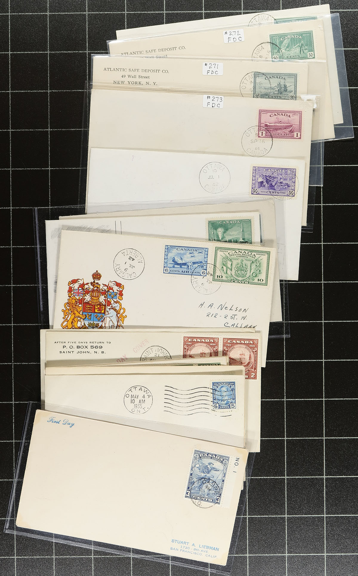 First Day Covers. Group of 20 early Canada first day covers, 1932-1952, in singles or set frankings, with Unitrade #s 191, 208, 210, 211-216 (214 x3), 261 (c.v. $50), 271, 272 (x2, $70 total), 273 ($55), 284-288 set, 294, 316, C7 E10 combination cover, with a few covers having private cachets. 2024 Unitrade =