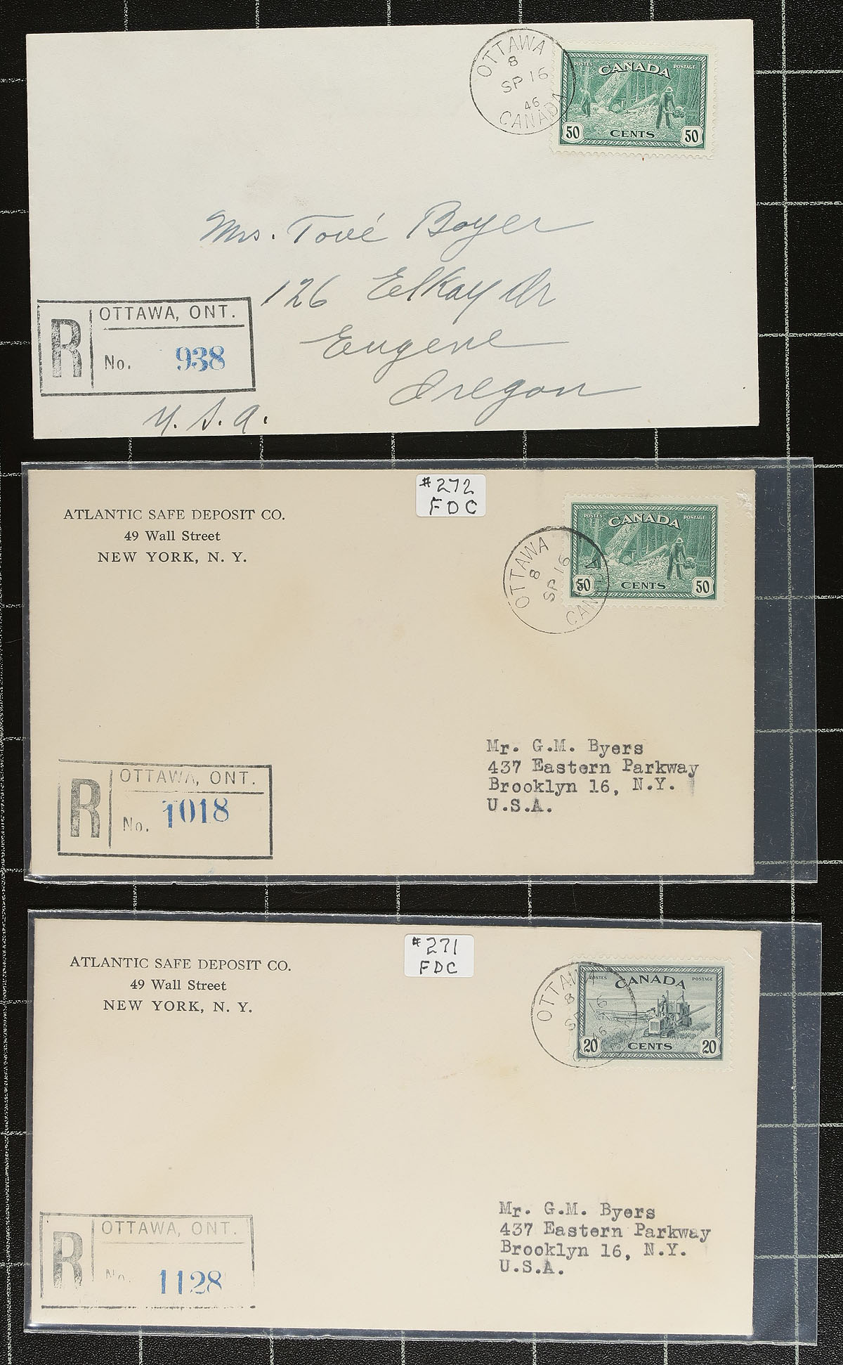 First Day Covers. Group of 20 early Canada first day covers, 1932-1952, in singles or set frankings, with Unitrade #s 191, 208, 210, 211-216 (214 x3), 261 (c.v. $50), 271, 272 (x2, $70 total), 273 ($55), 284-288 set, 294, 316, C7 E10 combination cover, with a few covers having private cachets. 2024 Unitrade =