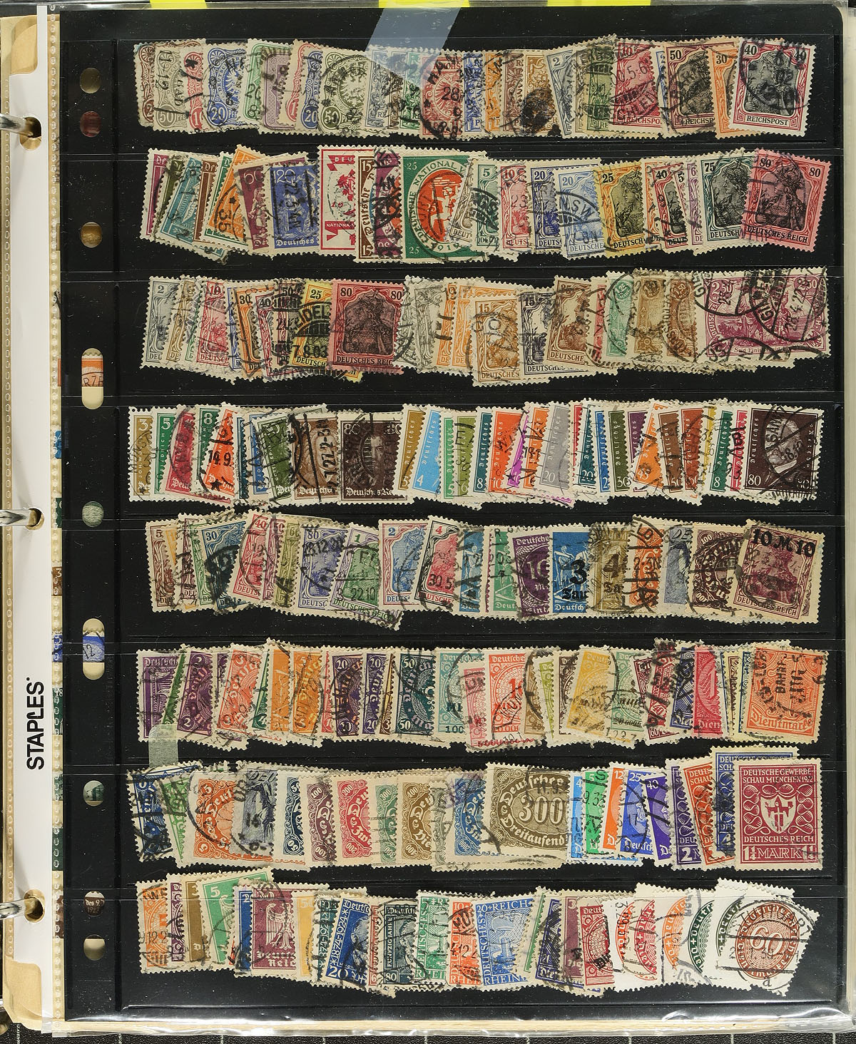 Collection / Accumulation of used Germany, 1872-2010, containing roughly 3,000 stamps in about 40 stuffed stock pages, housed in a binder. The lot generally ranges from Scott #17/2577, along with selections of semi-postals, Berlin, and DDR. A spot check indicated some stamps, sets and partial sets cataloguing $10 to $20 and up. Owner's 2019 Scott catalogue for the lot totals US$3,841.00, leaving potential finds to the dedicated collector. Postmark interest includes bridge and cds town cancel types, overall fine to very fine. Estimate =