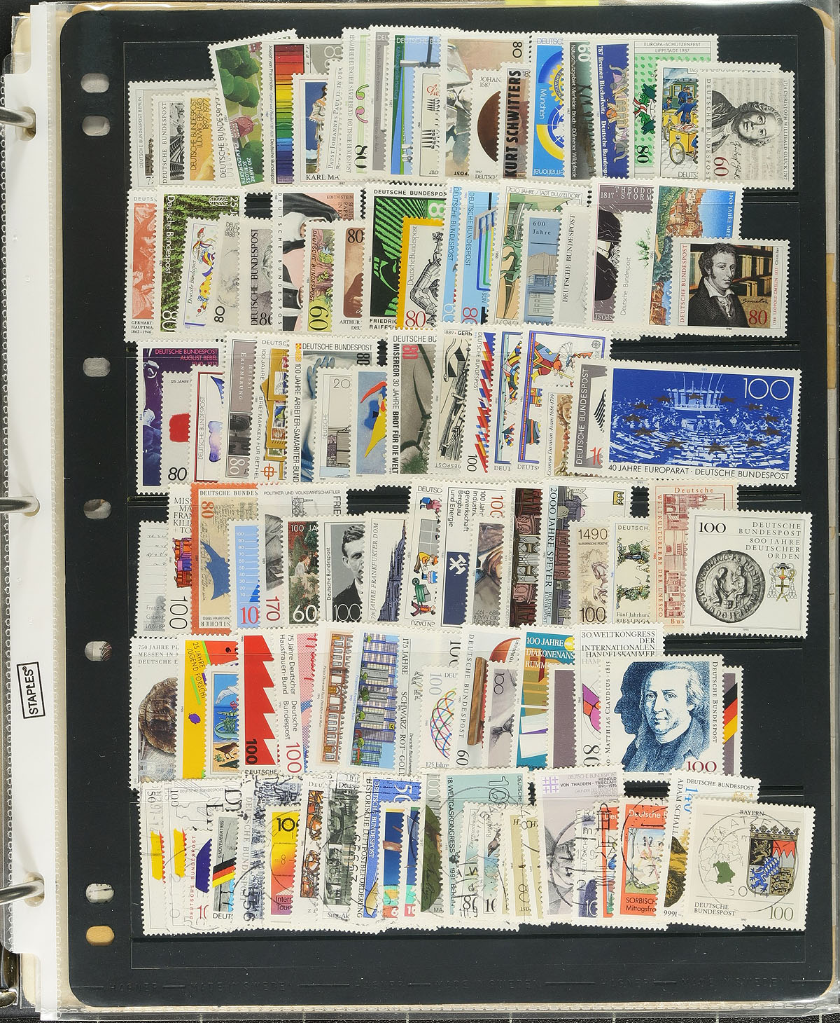 Collection / Accumulation of used Germany, 1872-2010, containing roughly 3,000 stamps in about 40 stuffed stock pages, housed in a binder. The lot generally ranges from Scott #17/2577, along with selections of semi-postals, Berlin, and DDR. A spot check indicated some stamps, sets and partial sets cataloguing $10 to $20 and up. Owner's 2019 Scott catalogue for the lot totals US$3,841.00, leaving potential finds to the dedicated collector. Postmark interest includes bridge and cds town cancel types, overall fine to very fine. Estimate =