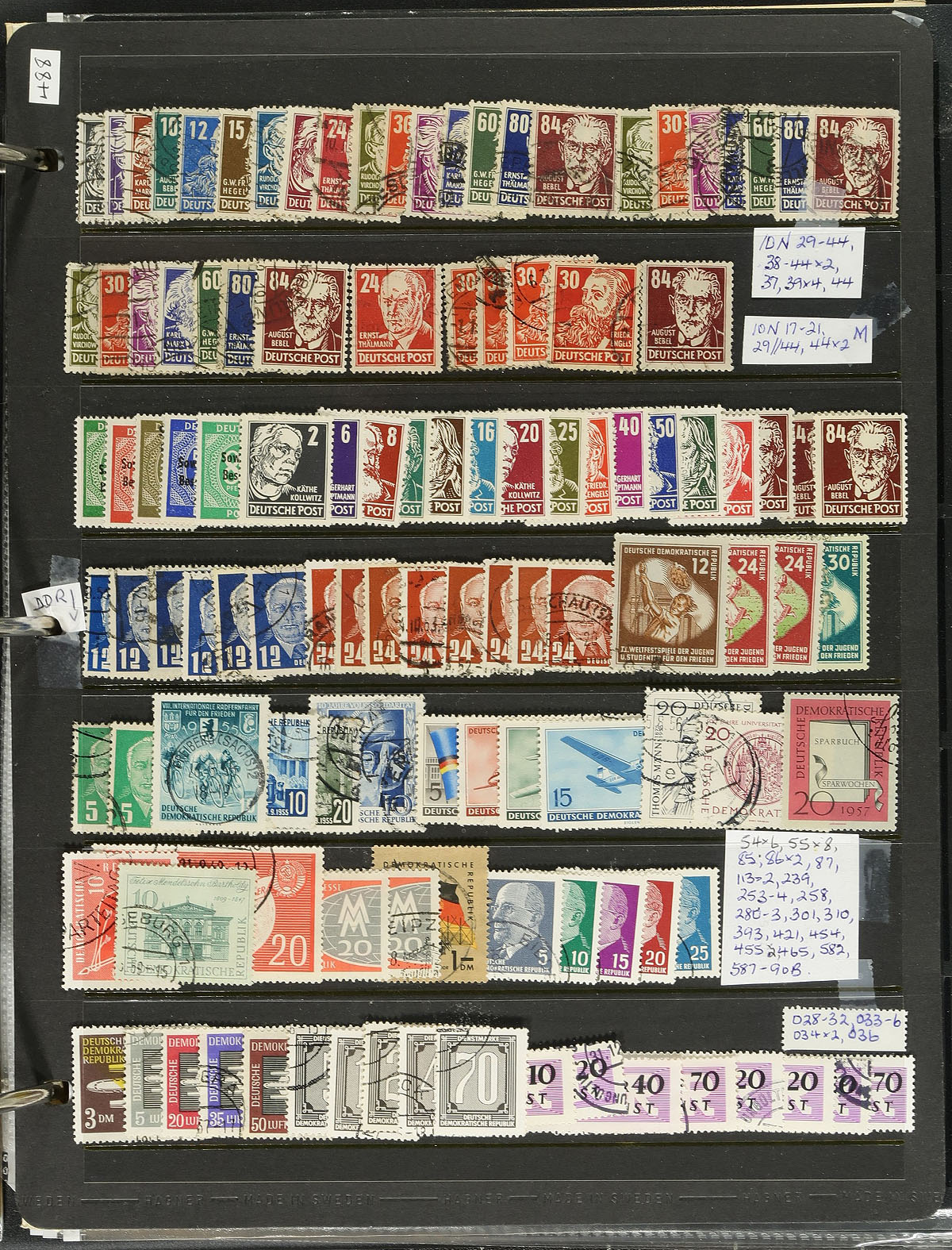 Collection / Accumulation of used Germany, 1872-2010, containing roughly 3,000 stamps in about 40 stuffed stock pages, housed in a binder. The lot generally ranges from Scott #17/2577, along with selections of semi-postals, Berlin, and DDR. A spot check indicated some stamps, sets and partial sets cataloguing $10 to $20 and up. Owner's 2019 Scott catalogue for the lot totals US$3,841.00, leaving potential finds to the dedicated collector. Postmark interest includes bridge and cds town cancel types, overall fine to very fine. Estimate =