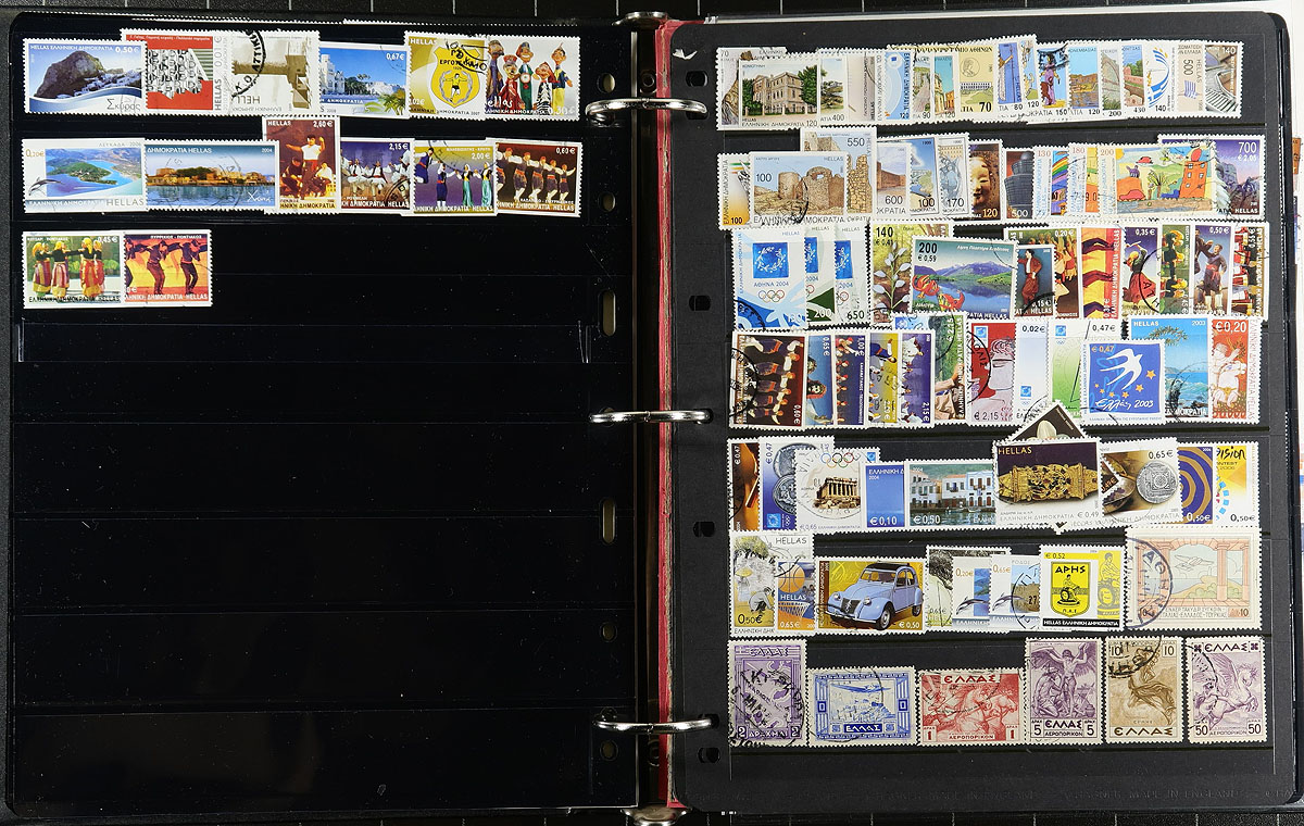 Collection / accumulation of used Greece, 1896-2013, containing roughly 1,300 stamps in 20 stock pages. The lot generally ranges from Scott #3/2593 with the strength of the lot in the modern used, generally running from the 1990s up to 2013 (mostly commemorative stamps), with postmark interest being bridge and cds town cancel types. Owner's 2014 Scott catalogue value totals US$1,444.00. A nice lot for the Greece or worldwide collector trying to fill spaces for modern used. Duplication up to 5 in some cases. Estimate =