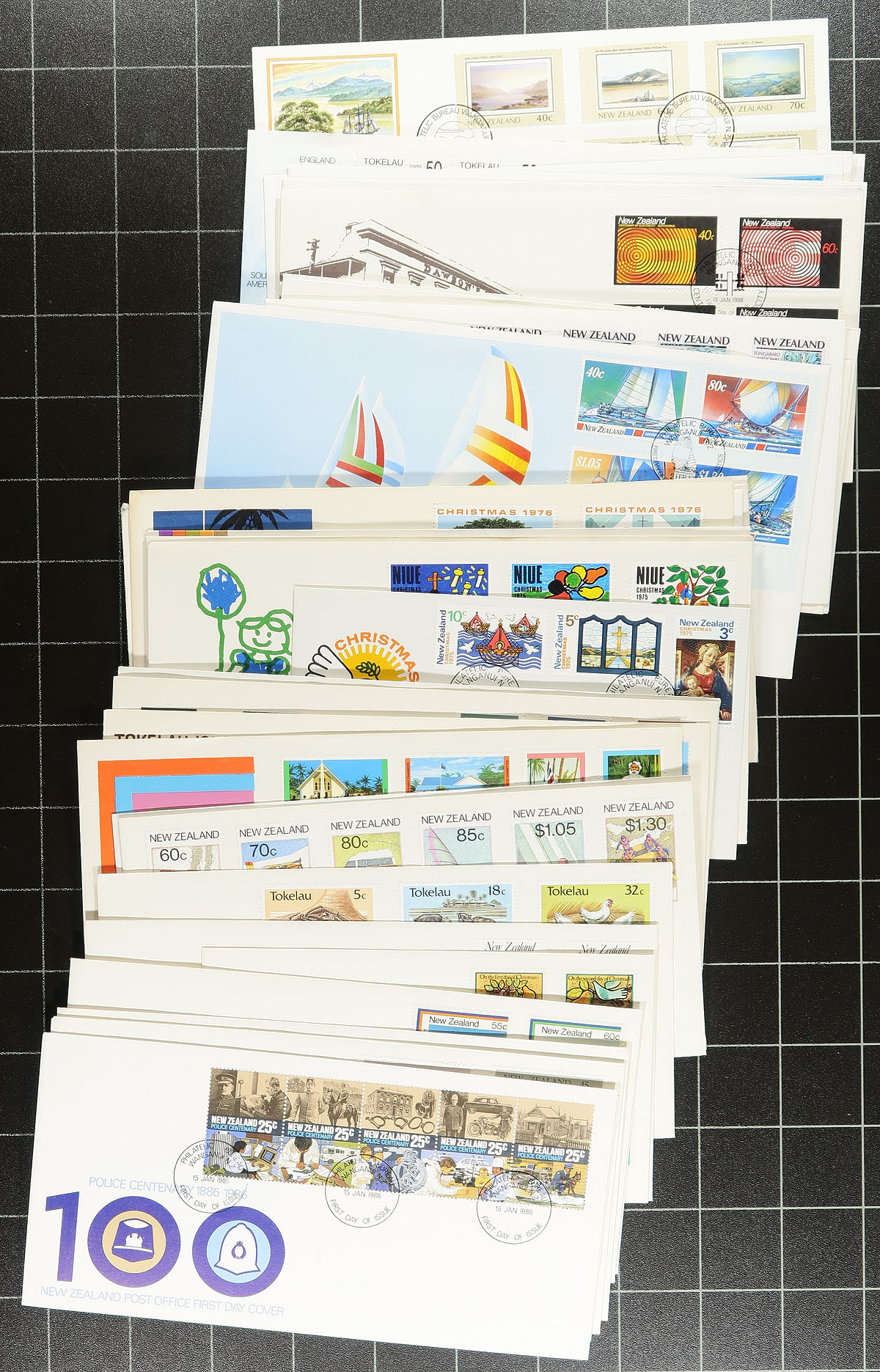 Lovely collection of roughly 370 New Zealand first day covers, 1937-1993, noting singles, pairs, and several sets frankings, including many Health stamps. The lot also includes a few commemorative covers (noting a few balloon posts), with many of the covers sleeved and priced from $2 to $4 each. A few faults with a few of the coves, and duplication up to 3 for a few issues. Estimate =