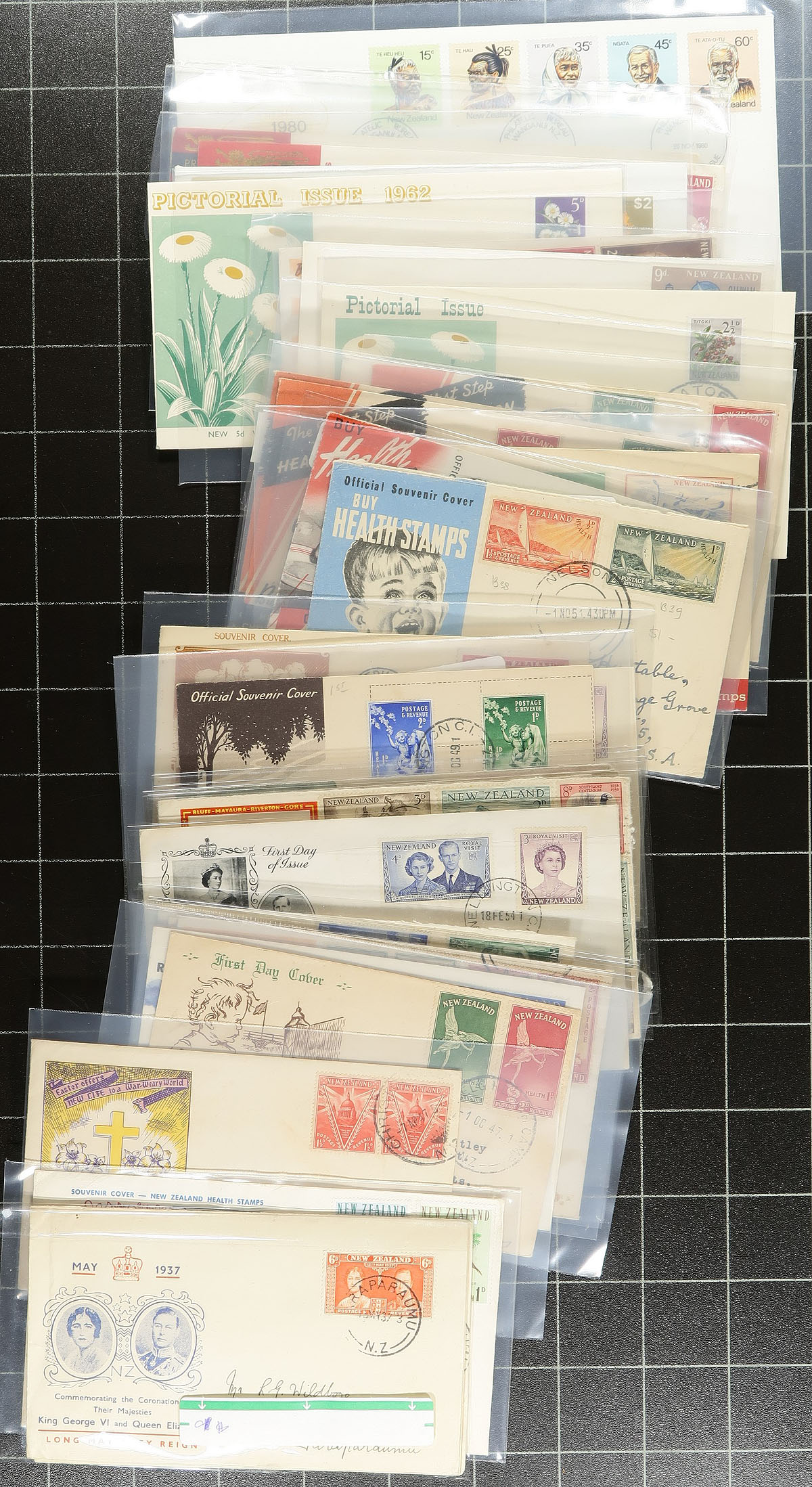 Lovely collection of roughly 370 New Zealand first day covers, 1937-1993, noting singles, pairs, and several sets frankings, including many Health stamps. The lot also includes a few commemorative covers (noting a few balloon posts), with many of the covers sleeved and priced from $2 to $4 each. A few faults with a few of the coves, and duplication up to 3 for a few issues. Estimate =
