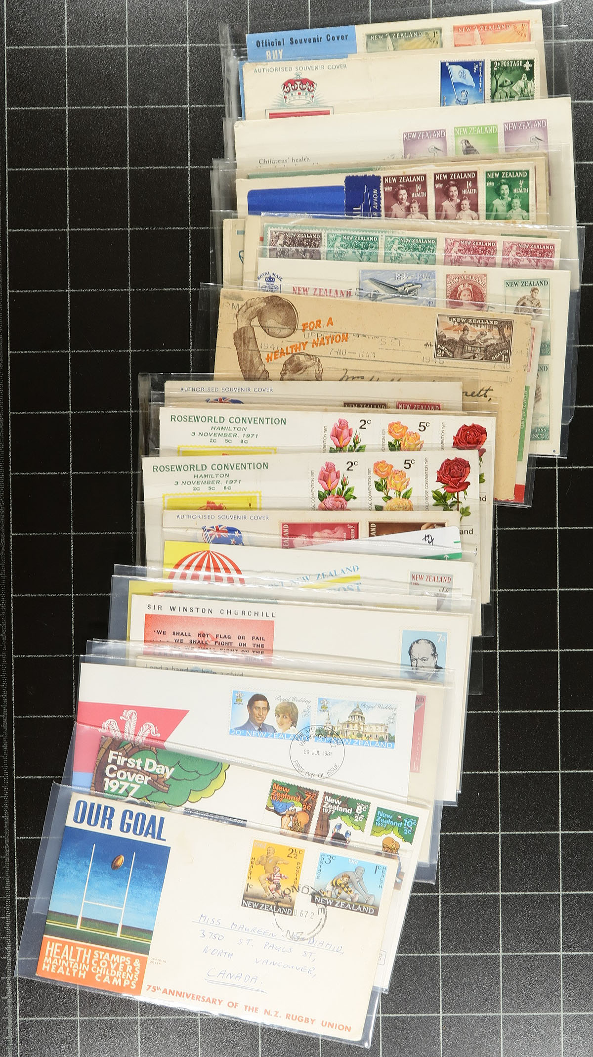 Lovely collection of roughly 370 New Zealand first day covers, 1937-1993, noting singles, pairs, and several sets frankings, including many Health stamps. The lot also includes a few commemorative covers (noting a few balloon posts), with many of the covers sleeved and priced from $2 to $4 each. A few faults with a few of the coves, and duplication up to 3 for a few issues. Estimate =