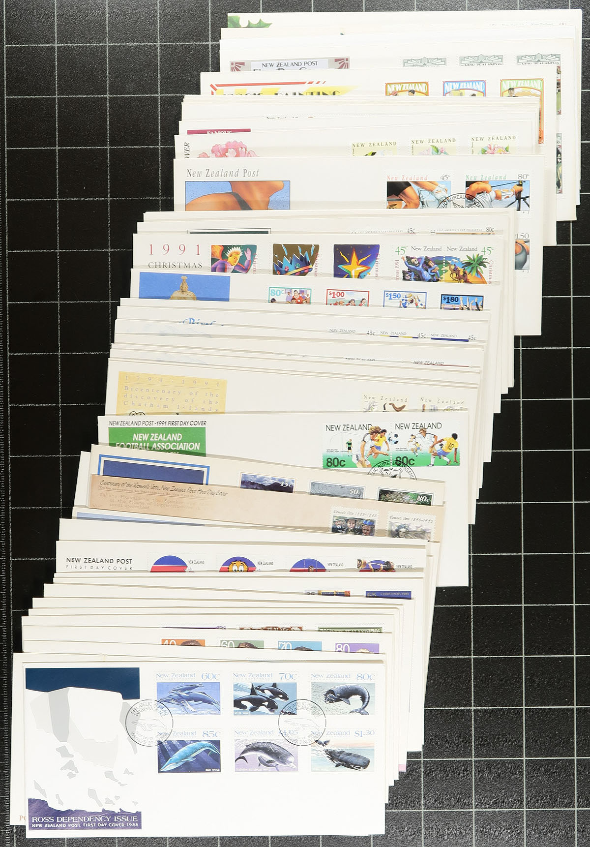 Lovely collection of roughly 370 New Zealand first day covers, 1937-1993, noting singles, pairs, and several sets frankings, including many Health stamps. The lot also includes a few commemorative covers (noting a few balloon posts), with many of the covers sleeved and priced from $2 to $4 each. A few faults with a few of the coves, and duplication up to 3 for a few issues. Estimate =
