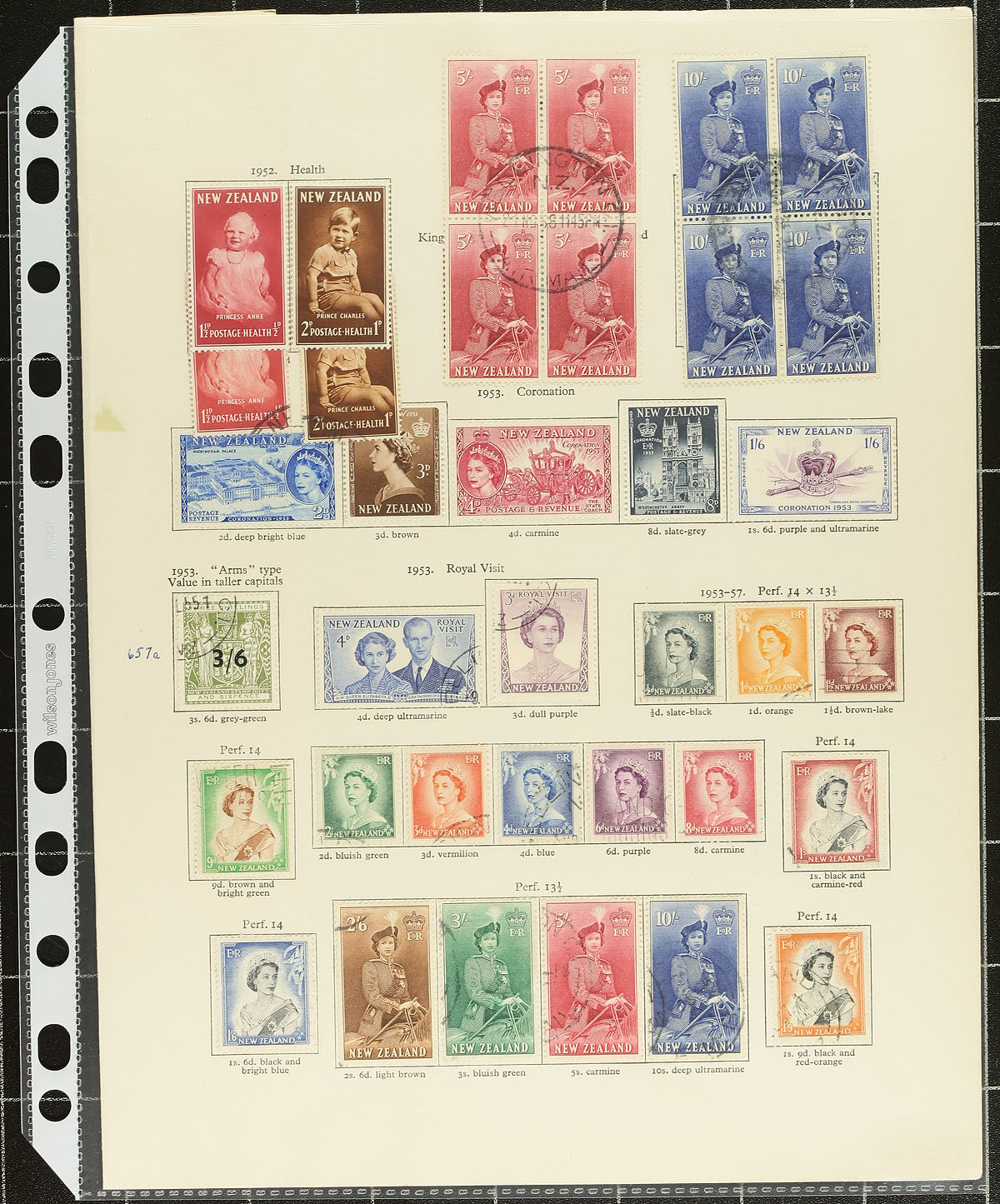 Collection / Accumulation of used New Zealand, 1880's-2012, containing roughly 2,500 stamps on several album or stock pages. The lot contains a wide variety of material including Victorian singles, with strength from the 1900's to the 1960's (including better sets), used blocks, back of the book material (including fiscals, officials, semi-postals, and more), noting some singles and sets cataloging $10 to $20 and up, including Scott #165-170 (c.v. $101 total). Owner's 2017 Scott catalogue value for the lot totals US$2,798.00, leaving better finds to the dedicated collector. A few faults expected, overall fine to very fine. Estimate =