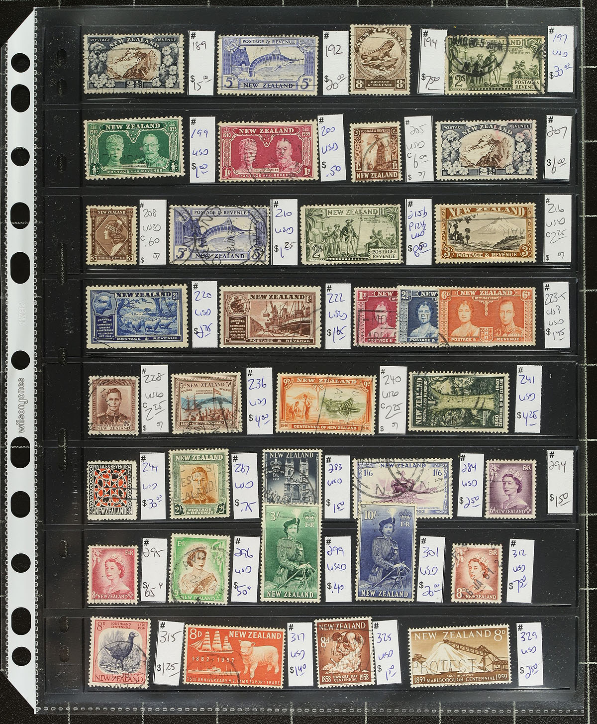 Collection / Accumulation of used New Zealand, 1880's-2012, containing roughly 2,500 stamps on several album or stock pages. The lot contains a wide variety of material including Victorian singles, with strength from the 1900's to the 1960's (including better sets), used blocks, back of the book material (including fiscals, officials, semi-postals, and more), noting some singles and sets cataloging $10 to $20 and up, including Scott #165-170 (c.v. $101 total). Owner's 2017 Scott catalogue value for the lot totals US$2,798.00, leaving better finds to the dedicated collector. A few faults expected, overall fine to very fine. Estimate =