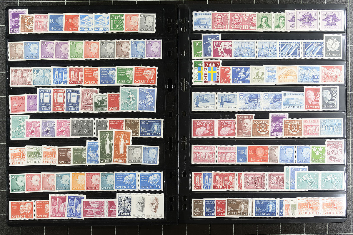 Collection of primarily never hinged Sweden, 1911-2011, containing roughly 950 stamps in 18 stock pages. The collection has a bit of everything, with strength in the 1930's to 1980's issues, including booklet singles, and souvenir sheets, noting some singles and sets cataloguing $5 to $15 and up, including Scott #479-483 sheets of 9 (nh, c.v. $90). Owner's 2019 Scott catalogue value for the collection totals US$1,443.00. Duplication up to 2 for some issues. A nice lot for collectors and dealers alike. Estimate =