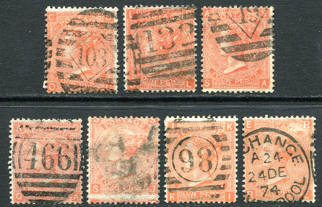 Fine used run of Plate Numbers of the 1865 issue 4p vermillion / dull vermillion Queen Victoria issue. Very clean offering from a meticulous collection. Includes #43 (plate 10-12) and 43a (plates 7-8, 13-14). Only missing plate #9 to be complete. 2024 Scott Classic US$597.50 =